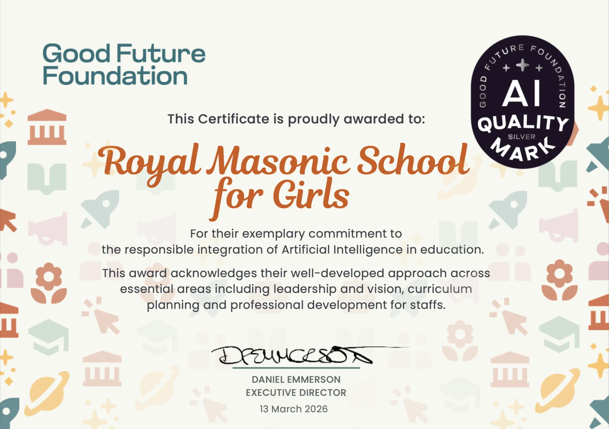 We are delighted to announce that the Royal Masonic School for Girls has been officially awarded the Silver AI Quality Mark by the Good Future Foundation (GFF). The GFF assessor praised our clear strategy, noting that at RMS, technical tools never overshadow the fundamental need for human thinking.