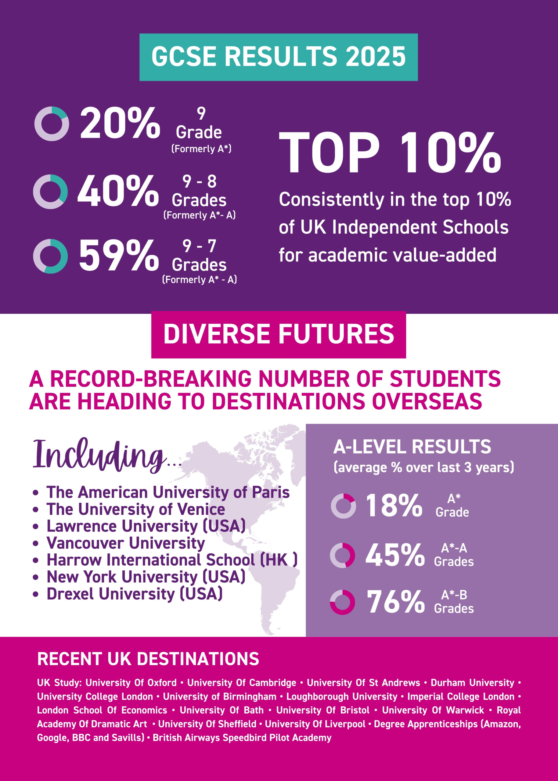 A record-breaking number of students are heading to universities overseas, with destinations including the American University of Paris, the University of Venice, Lawrence University in the USA, Vancouver University and an exciting GAP year at Harrow International School in Hong Kong. Several students received merit and sports scholarships, including a place at New York University (NYU).